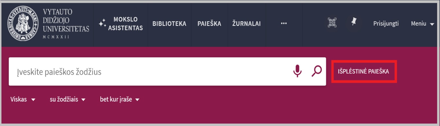 Paspaudus mygtuką Išplėstinė paieška, atsiveria langas, kuriame galima ieškoti pagal sudėtingesnes užklausas.