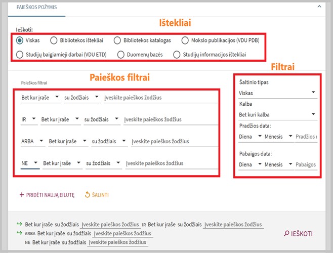 - Kuriuose įrašo laukuose (antraštės, autoriaus, temos ir pan.) bus atliekama paieška.