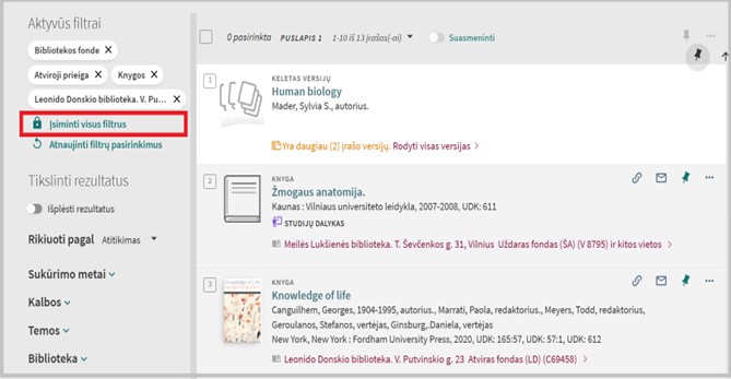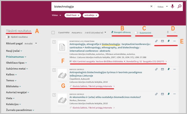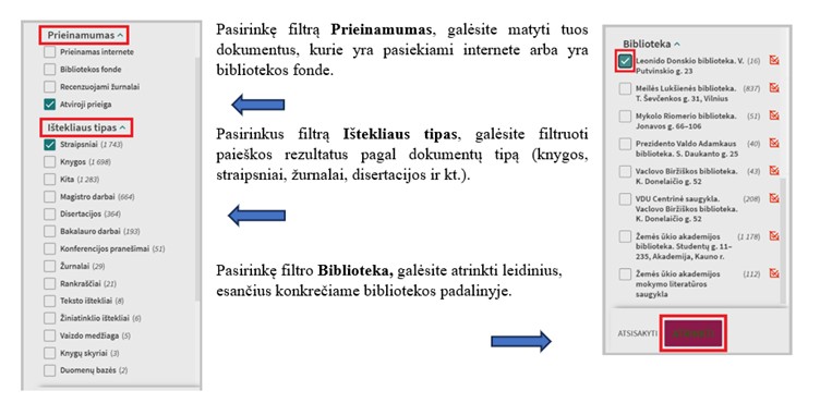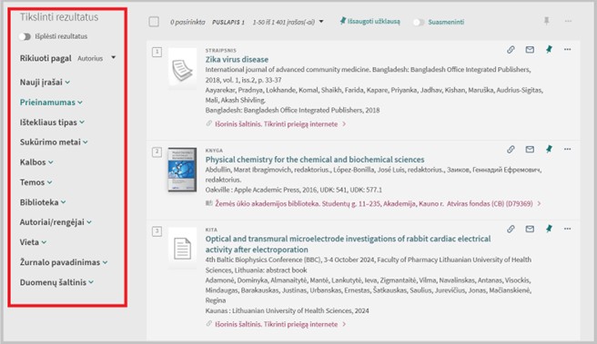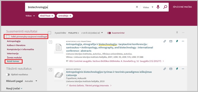 Paieškos rezultato tikslinimas – surastų įrašų atrinkimas pagal iš anksto numatytas grupes. Funkciją Tikslinti rezultatus rasite ekrano kairiajame šone. Kiekvienas atrankos kriterijų galite pasirinkti, tuomet į paieškos rezultatus bus įtraukiami tik įrašai, atitinkantys pasirinktą kriterijų arba bus pašalinti įrašai, neatitinkantys pasirinkto kriterijaus.