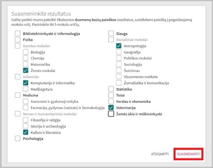 Suasmeninę paiešką galėsite atsirinkti naujesnius įrašus, pakeisti pasirinktas mokslo sritis.