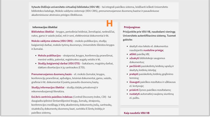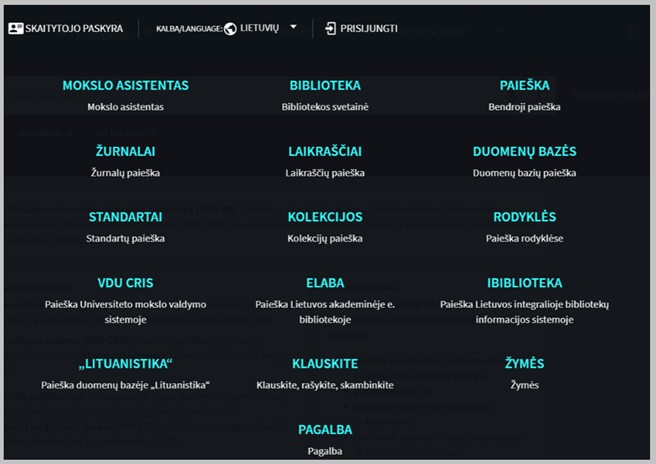 Vytauto Didžiojo universiteto virtualioji biblioteka (VDU VB) – tai integrali paieškos sistema, leidžianti ieškoti Universiteto bibliotekos kataloge, Mokslo valdymo sistemoje (VDU CRIS), prenumeruojamose duomenų bazėse ir pasauliniuose akademiniuose atvirosios prieigos ištekliuose.