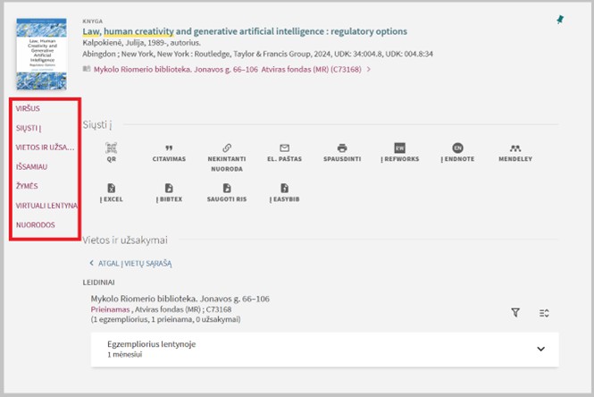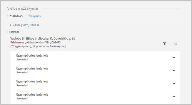 - VIETOS IR UŽSAKYMAI skirta tik fiziniams ištekliams. Čia pateikiama informacija apie leidinio saugojimo vietas, skolinimo sąlygas ir suteikiama galimybė leidinį užsakyti, jeigu leidžia leidinio statusas.