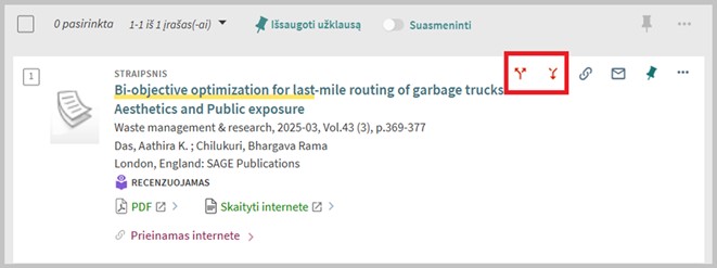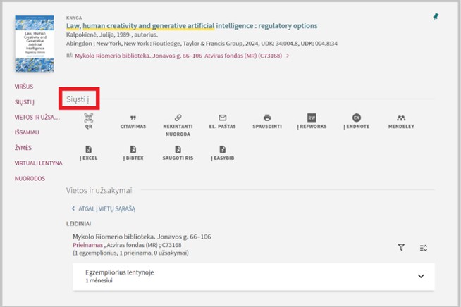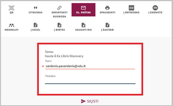 - SIŲSTI Į leidžia įrašą išsaugoti, išsiųsti el. paštu, nusiųsti į citavimo aprašų sudarymo programą ar atlikti kitokius veiksmus su įrašu.