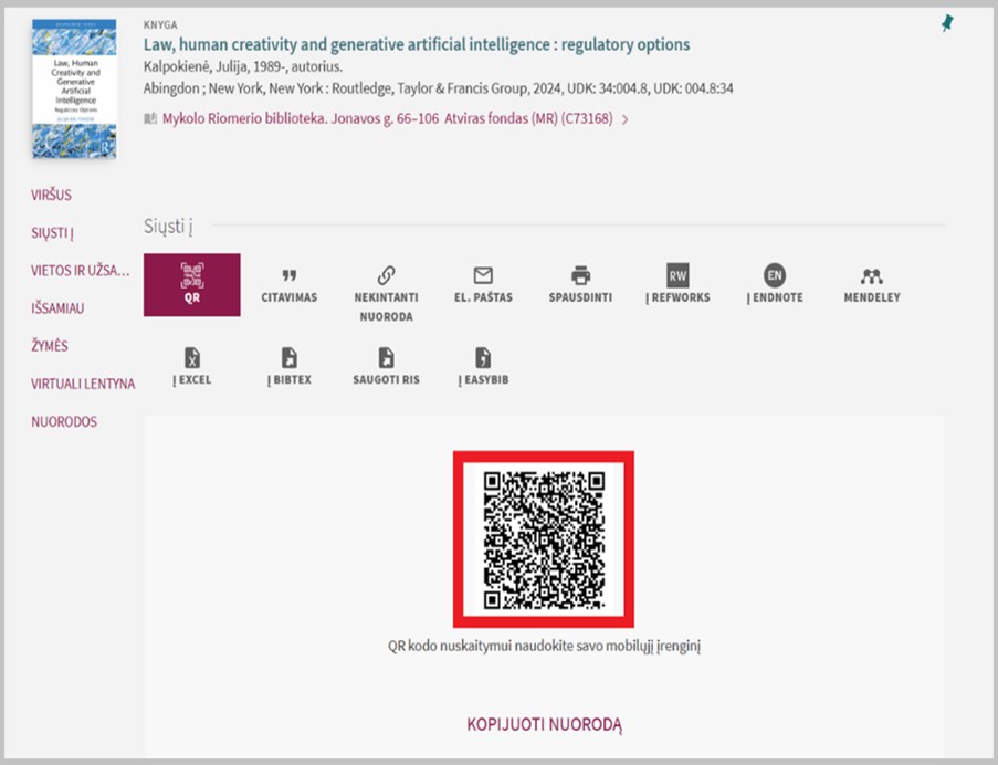 Paspaudus piktogramą QR, pateikiamas įrašo QR kodas, kurį galima naudoti patogiam paieškos rezultatų dalijimuisi su kitais.