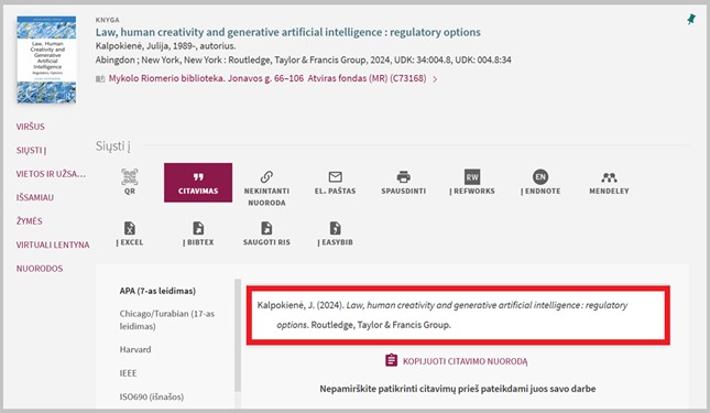 Paspaudus piktogramą CITAVIMAS pateikiamas leidinio bibliografinis aprašas pagal pasirinktą citavimo stilių.
