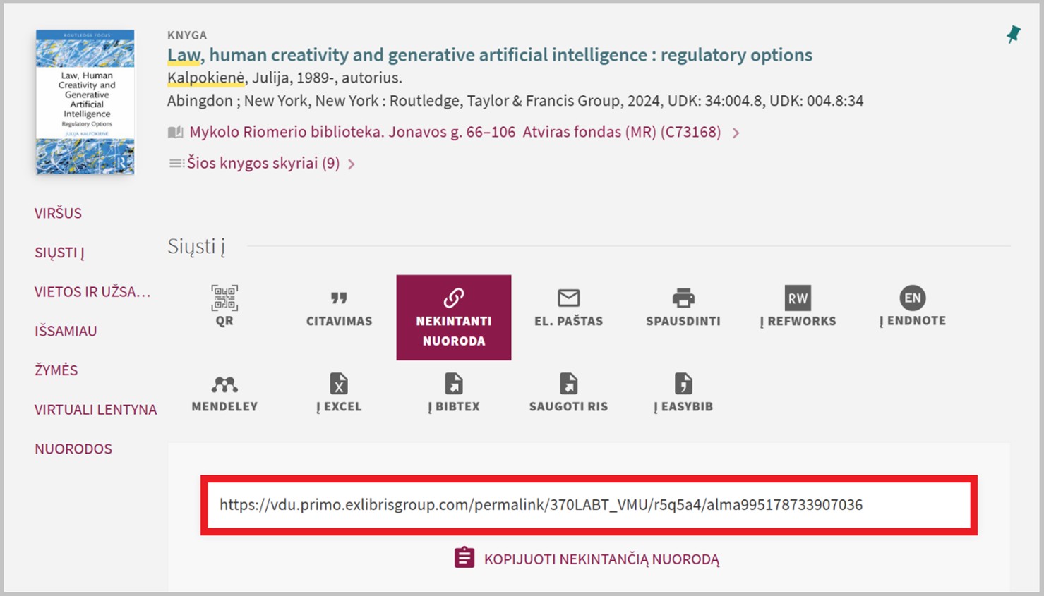 Paspaudus piktogramą NEKINTANTI NUORODA suformuojama nekintanti įrašo nuoroda, kurią galima nukopijuoti.