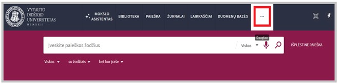 Viršutinėje meniu juostoje pateikiami ištekliai, kuriuose galima atlikti paiešką. Šalia yra daugtaškio piktograma.