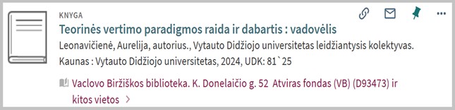 F – Leidinio saugojimo vieta VDU bibliotekoje. Spragtelėjus matysite išsamią leidinio prieinamumo informaciją ir galėsite leidinį užsakyti, jei tą leidžia leidinio statusas. Plačiau skyriuje Leidinio užsakymas.