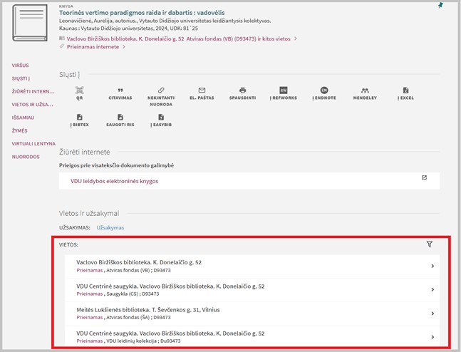 - Atsivėrusiame lange skyriuje VIETOS matysite, kuriuose bibliotekos padaliniuose šis leidinys yra ir jo skolinimo sąlygas.