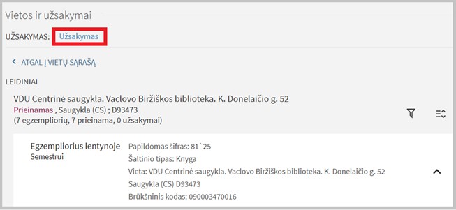 - UŽSAKYMAS. Neprasidėjo. Vieta eilėje: 1, 2 ir t. t.: Užsakytas kito skaitytojo paimtas leidinys, kurį pasiskolinti galima bus tada, kai leidinys bus grąžintas.