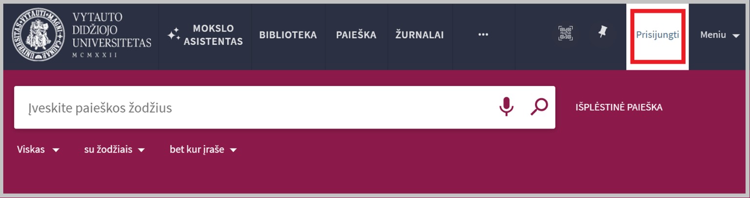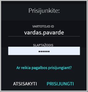 Norėdami prisijungti, pagrindiniame sąsajos meniu lango viršuje, spustelėkite mygtuką Prisijungti.