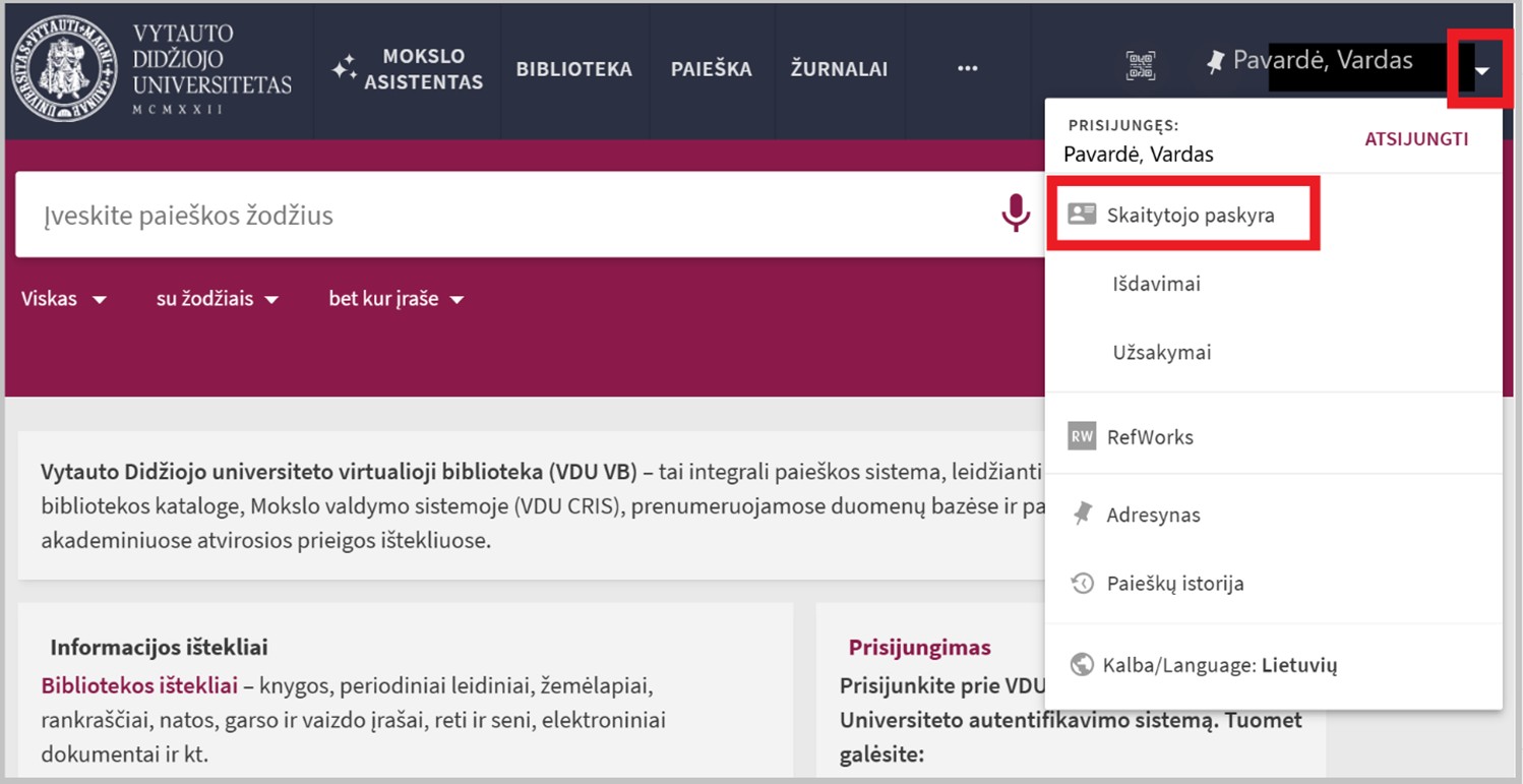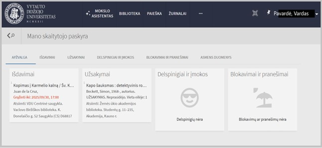 Prisijungę prie asmeninės Skaitytojo paskyros, matysite: