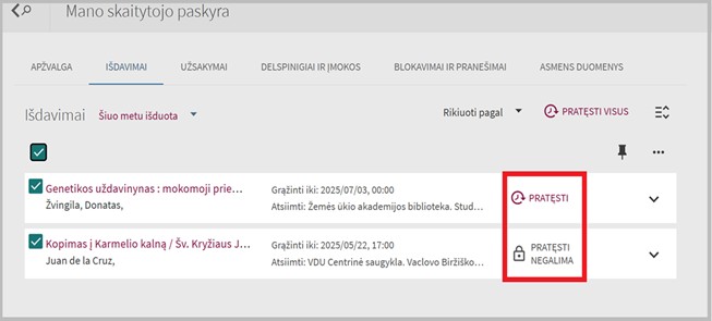 Termino pratęsti nepavyks, jeigu vėluojama grąžinti leidinį arba jo laukia kitas vartotojas. Prie tokio leidinio bus pažymėta PRATĘSTI NEGALIMA.