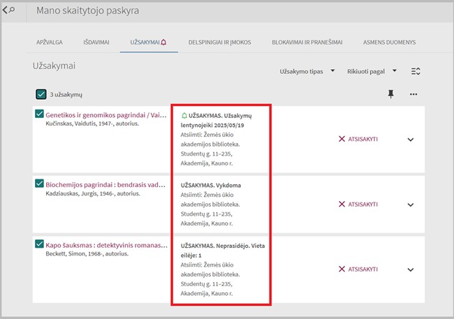 - UŽSAKYMAS. Užsakymų lentynoje iki 20XX XX XX: Užsakymas įvykdytas, iki nurodytos dienos leidinį reikia pasiimti tame bibliotekos padalinyje, kuriame jis laikomas.
