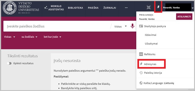 Adresynas pasiekiamas pasirenkant lango viršuje smeigtuko mygtuką