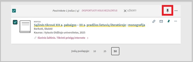 Norėdami išsaugoti pasirinktą įrašą, atlikite paiešką ir paieškos rezultatų sąraše spustelėkite reikiamo įrašo išsaugojimo mygtuką