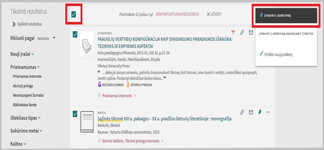 Išsaugoti visus įrašus vienu metu galima paieškos rezultatus pažymėjus varnele