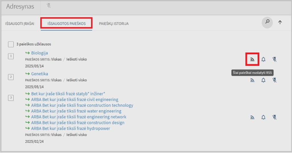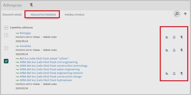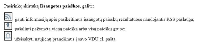 - IŠSAUGOTOS PAIEŠKOS– išsaugotos paieškos užklausos, jų valdymas, RSS paslaugos užsakymas;