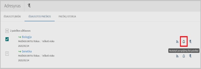 - Paspauskite piktogramą Nustatyti perspėjimą šiai paieškai prie reikiamos paieškos.