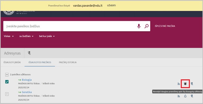 Į nurodytą el. pašto adresą bus siunčiami perspėjimai. Jei nebenorite jų gauti, galite išjungti perspėjimą. Prie išsaugotos paieškos, kuriai nustatytas perspėjimų siuntimas, paspauskite mygtuką