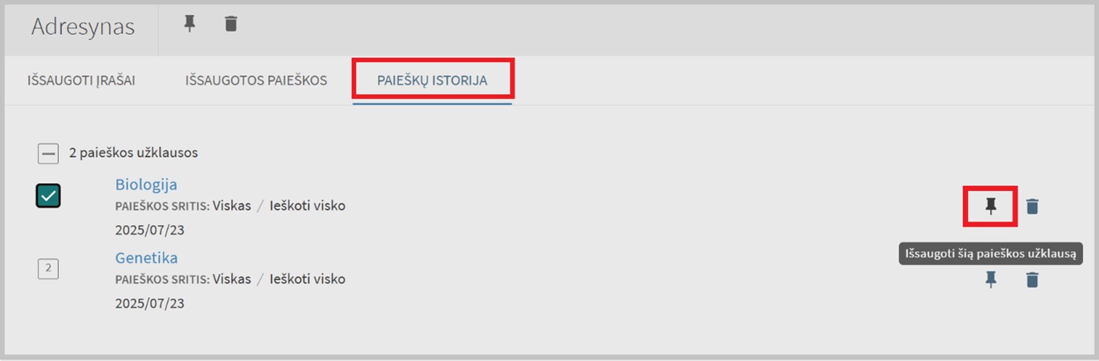 Taip pat galite pažymėti kelias pageidaujamas paieškas ir spragtelėti mygtuką Išsaugoti šią paieškos užklausą.